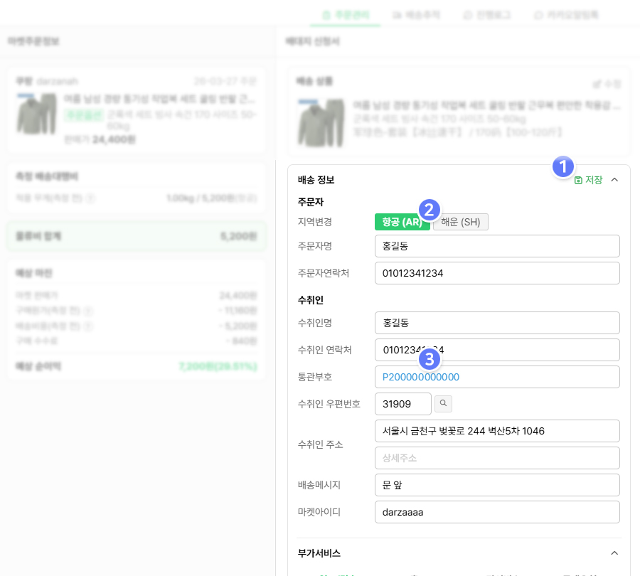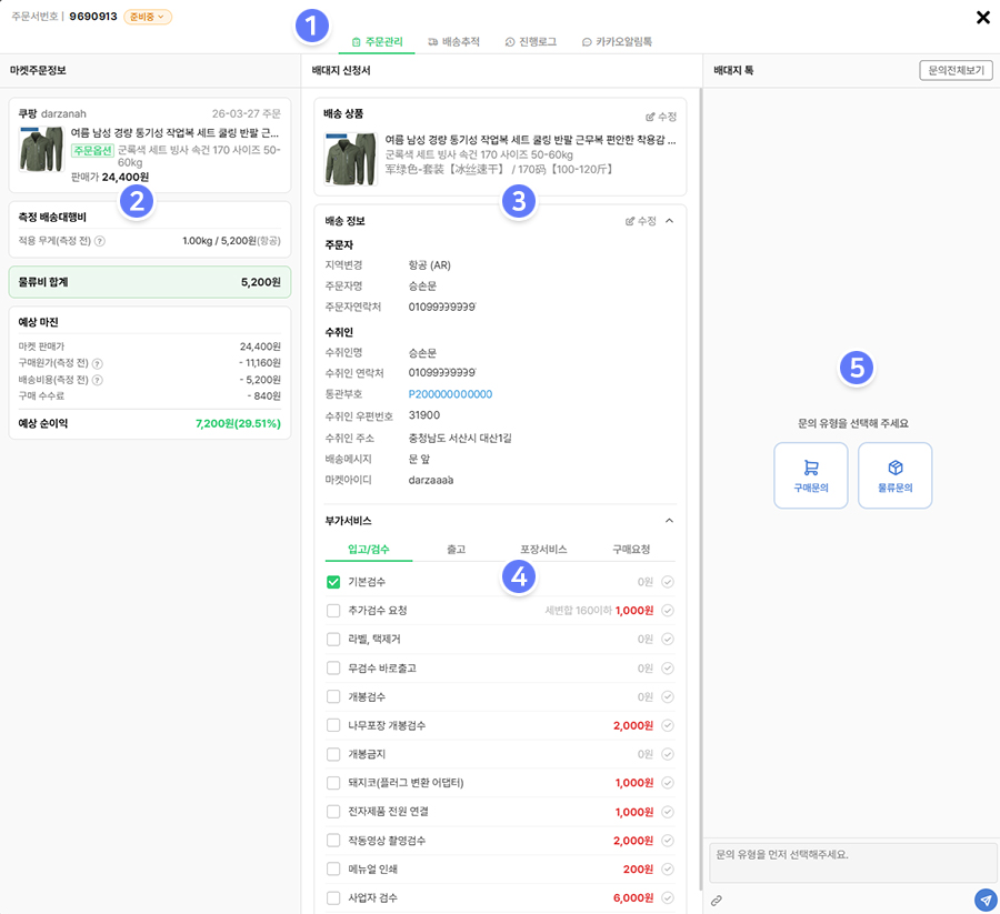 배대지 주문서의 우측에 "주문관리" 버튼이 있습니다. 클릭 하시면 주문을 처리하기 위한 다양한 기능을 제공 합니다.