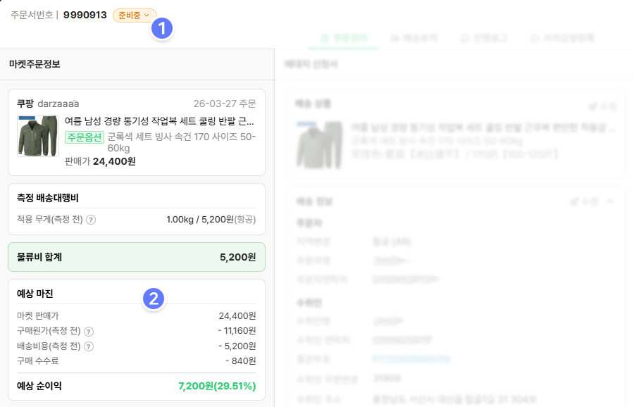 판매 금액을 기준으로 대략적인 마진을 계산합니다. 배대지 패킹 완료 이후에는 실측이 되므로 더 정확한 마진을 계산합니다.